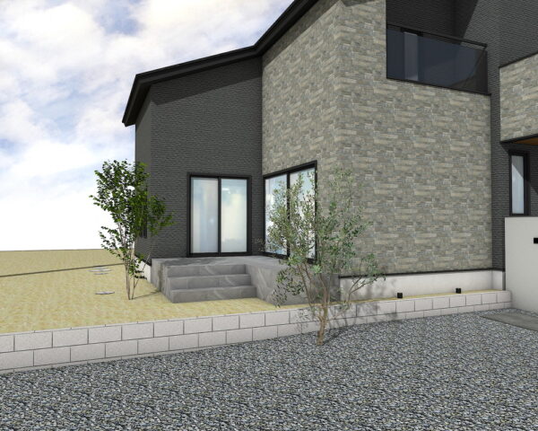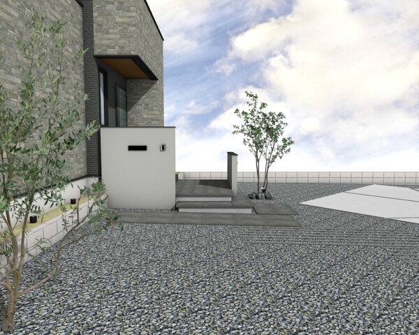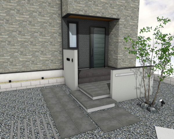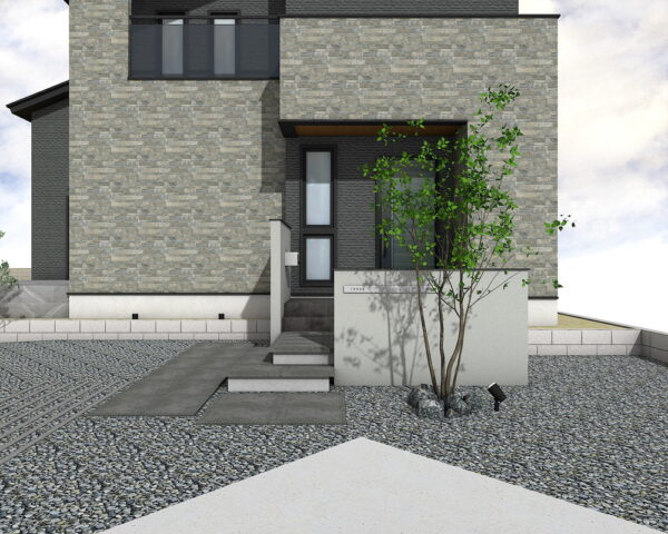 住まいへと誘うアプローチには、落ち着いたニュートダーク色の舗装材を広々と配置。ステップは蹴込50mmのフローティング仕様で軽やかな印象を演出します。グレーのボーダーが直線的な美しさを際立たせ、機能的でありながらもデザイン性の高い玄関へと導きます。