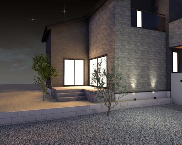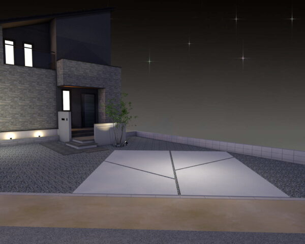 夜のエクステリアを美しく照らす照明計画も魅力です。上方配光タイプのスタンドライトと集光スポットライトが、植栽やアプローチを効果的にライトアップ。照度センサー付きの消灯タイマ付スイッチで、安全性と省エネを両立し、幻想的な夜景を創り出します。