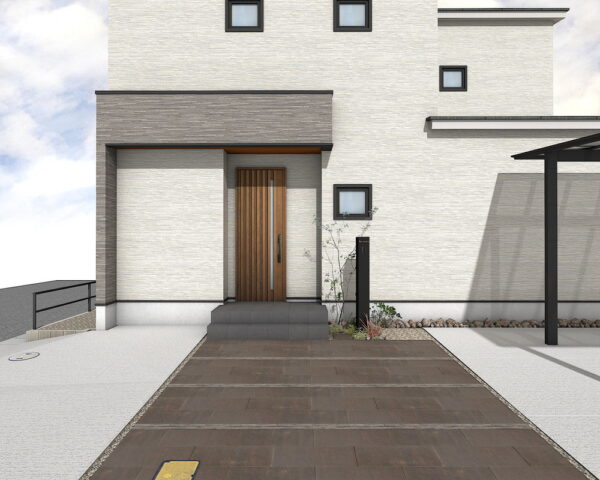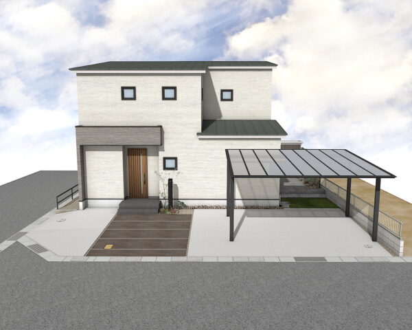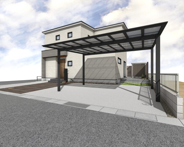 広々とした土間コンクリートの駐車スペースは、刷毛引き仕上げで美しい表情に。化粧砂利の割溝とエキスパンタイがアクセントとなり、洗練された印象を与えます。2台用のネスカFカーポートは、大切なお車を雨や日差しから守りつつ、M様邸に調和する、機能美を追求した快適な駐車空間です。