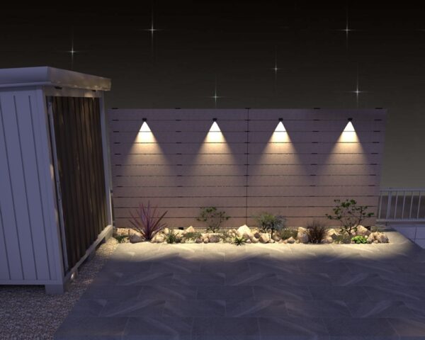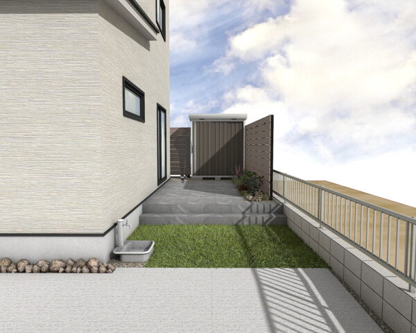建物周りには、ディープグレーのアヴェルサタイルテラスを設け、広々としたアウトドアリビング空間を実現。手入れが簡単なクローバーターフ人工芝は、一年中鮮やかな緑を提供し、美しい景観を保ちます。庭へのアクセスをスムーズにするモルタル仕上げのステップも配置し、M様邸での快適な時間を育みます。