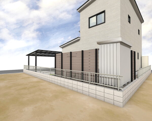 M様邸の境界には、既存の塀を活かしながら、グレージュのエコモックフェンスでプライベート空間を美しく確保。マットブラックのアルミ柱がアクセントとなり、モダンな雰囲気を高めます。シンプレオフェンスも組み合わせ、周囲との調和を図り、美しさと安心感を両立する境界を創造しました。