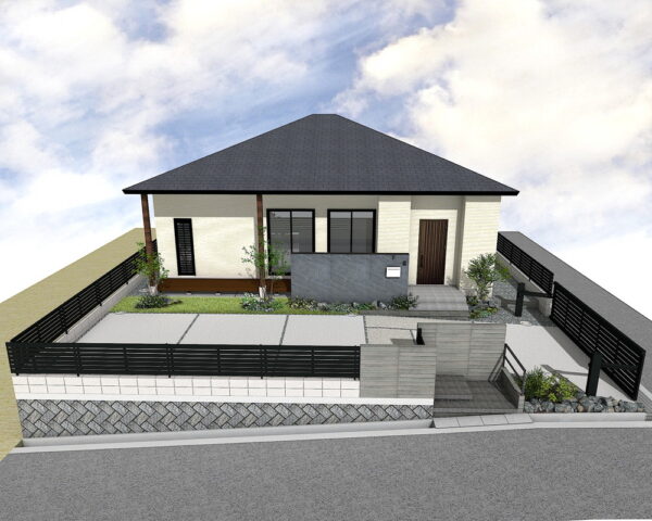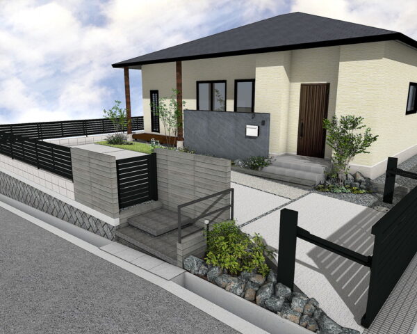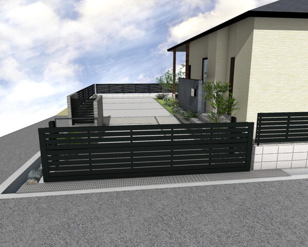 既存の石積みに加えて、モデリートの土留めとコンクリートブロック塀が敷地をしっかりと囲み、プライバシーを確保します。フェンスは、レジリアYK3型、シンプレフェンス T2型、ルシアス フェンスLite A02型といった異なるデザインを適所に配置し、機能性とデザイン性を両立。統一感のあるブラックで仕上げ、全体に洗練された印象を与えます。