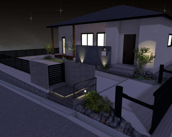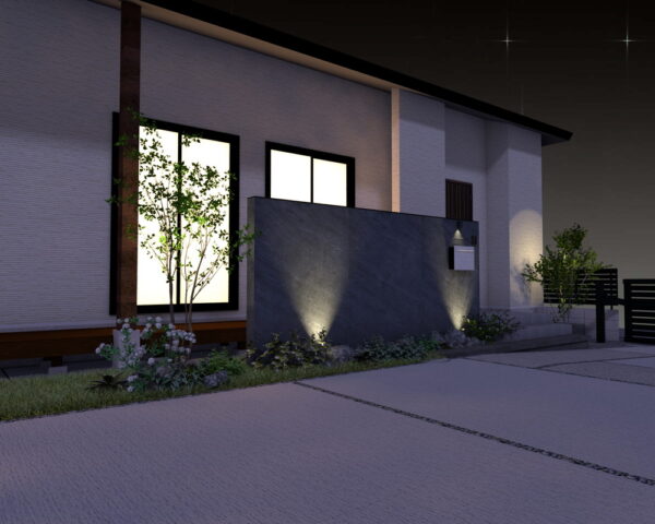 夜のエクステリアを彩る照明計画は、多灯使いで立体的な美しさを演出します。シームレス ライン ライトが壁面を照らし、美彩 ローポールライトがアプローチを優しく導きます。美彩 グランドライトやスパイクスポットライトが植栽を下から照らし、樹木の陰影を際立たせます。プリモ ウォールライトも加わり、防犯性と幻想的な雰囲気を両立した空間です。