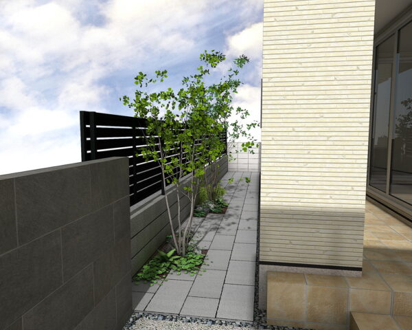 建物周囲は、防草シートと単粒度砕石敷きで、美しい景観を保ちつつメンテナンスの手間を軽減。庭スペースには洗練されたプラーガペイブを配置しました。落ち着いた色合いのプラドハスキーが建物と調和し、モダンで居心地の良いアウトドアリビングを創出。機能美を追求した空間です。