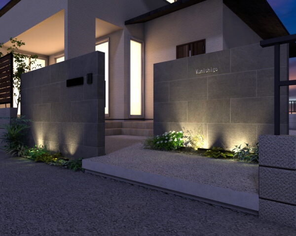 夜のエントランスを美しく彩る照明計画は、美彩ウォールバーライトが門柱を照らし、幻想的な雰囲気を醸し出します。オプションのシームレスラインライトは境界塀に組み込み、防犯性を高めつつ夜の外観に上品な光のラインをプラス。昼とは異なる表情で、K様邸の魅力を引き立てます。